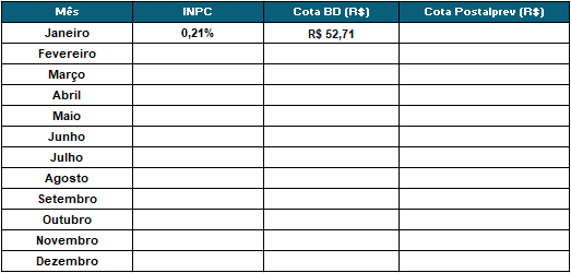 | Mês | INPC | Cota BD | Cota Postalprev |