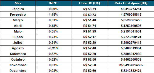 | Mês | INPC | Cota BD | Cota PostalPrev | Variação percentual da cota PostalPrev |